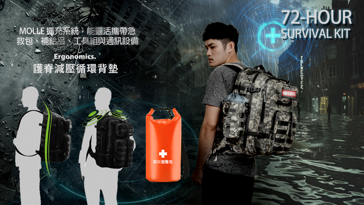在氣候異常與地緣風險升高的背景下,防災不再只是有備無患的選項,而逐漸成為每個人生活中的實質準備。相較於基礎型的防水背包款式,具備高度擴充性與模組化設計的「3Day 戰術背包」,正被越來越多重視自我應變能力的使用者納入防災裝備清單中。 3Day 背包原本源自軍用概念,設計用於部隊於野外執行 72 小時任務所需之裝備承載。其耐用材質、多口袋系統、模組化 MOLLE 擴充設計、與舒適背負功能,讓它不僅適用於軍警單位,也逐漸進入個人防災與戶外應變市場,成為高階防災包的熱門選項。