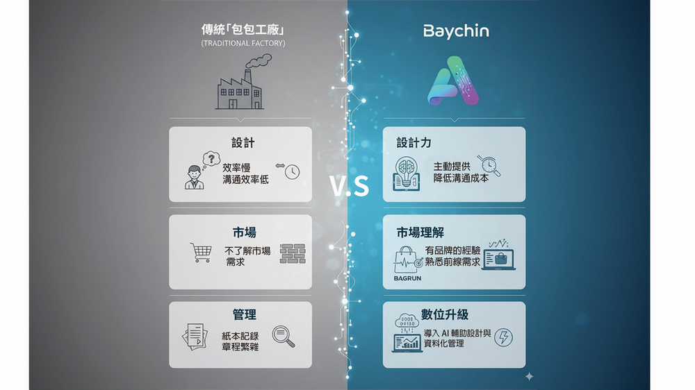 與傳統「包包工廠」相比,Baychin的差異化優勢在於: