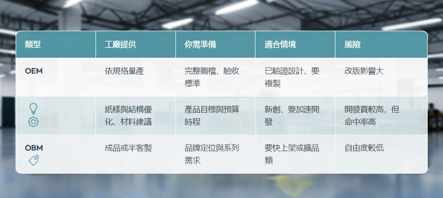 在包包工廠的合作裡,先選合作模式,再談價格 不同模式的工作分工不同,影響開發速度、自由度與成本。