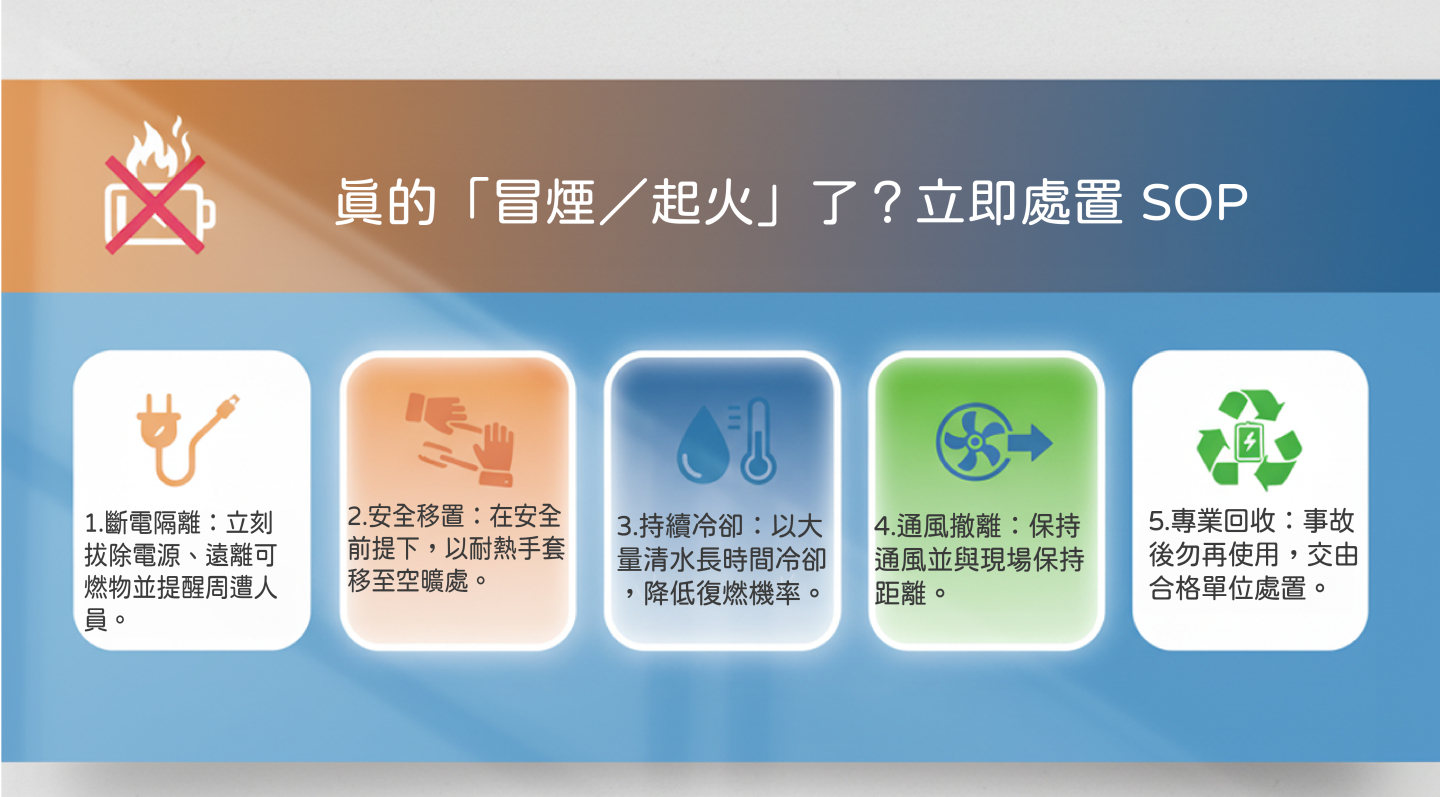 異常徵兆:發熱、鼓脹、異味=立刻停用,依 SOP 處置。